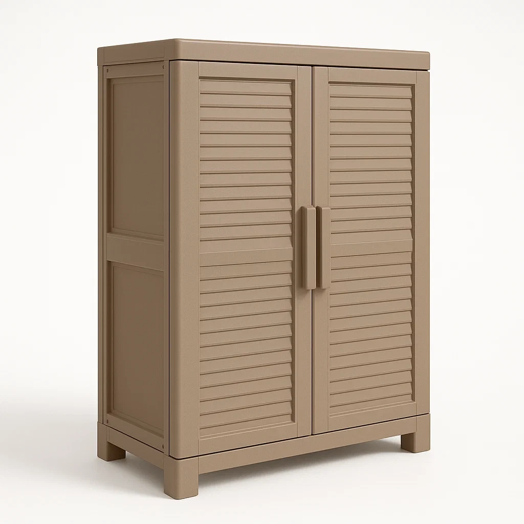 Diseño: Estructura con puertas de persiana y asas para facilitar el acceso.