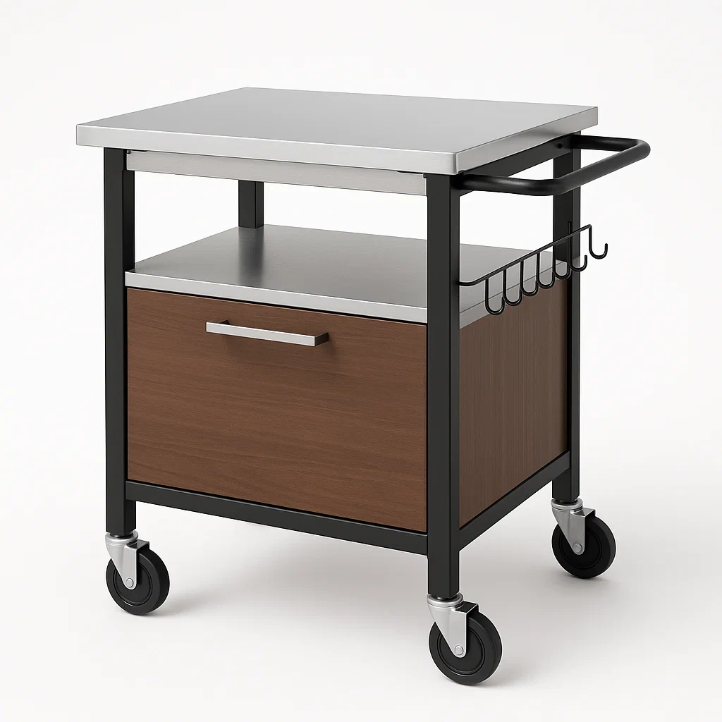 El carrito de cocina está construido con materiales de alta calidad. El marco está hecho de acero pintado, la superficie es de acero inoxidable y el cuerpo es de tablero de partículas con chapa de madera.