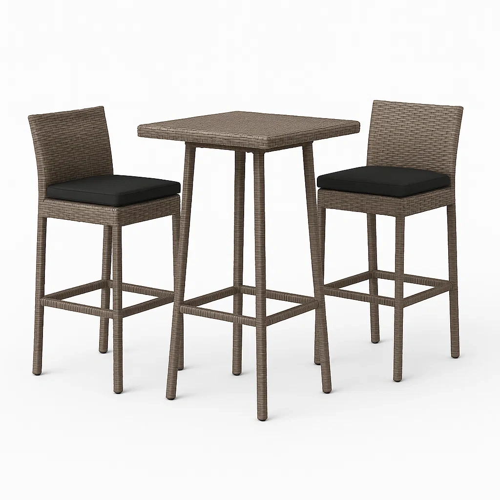 Lista de contenido: Una mesa alta y dos sillas con cojines.