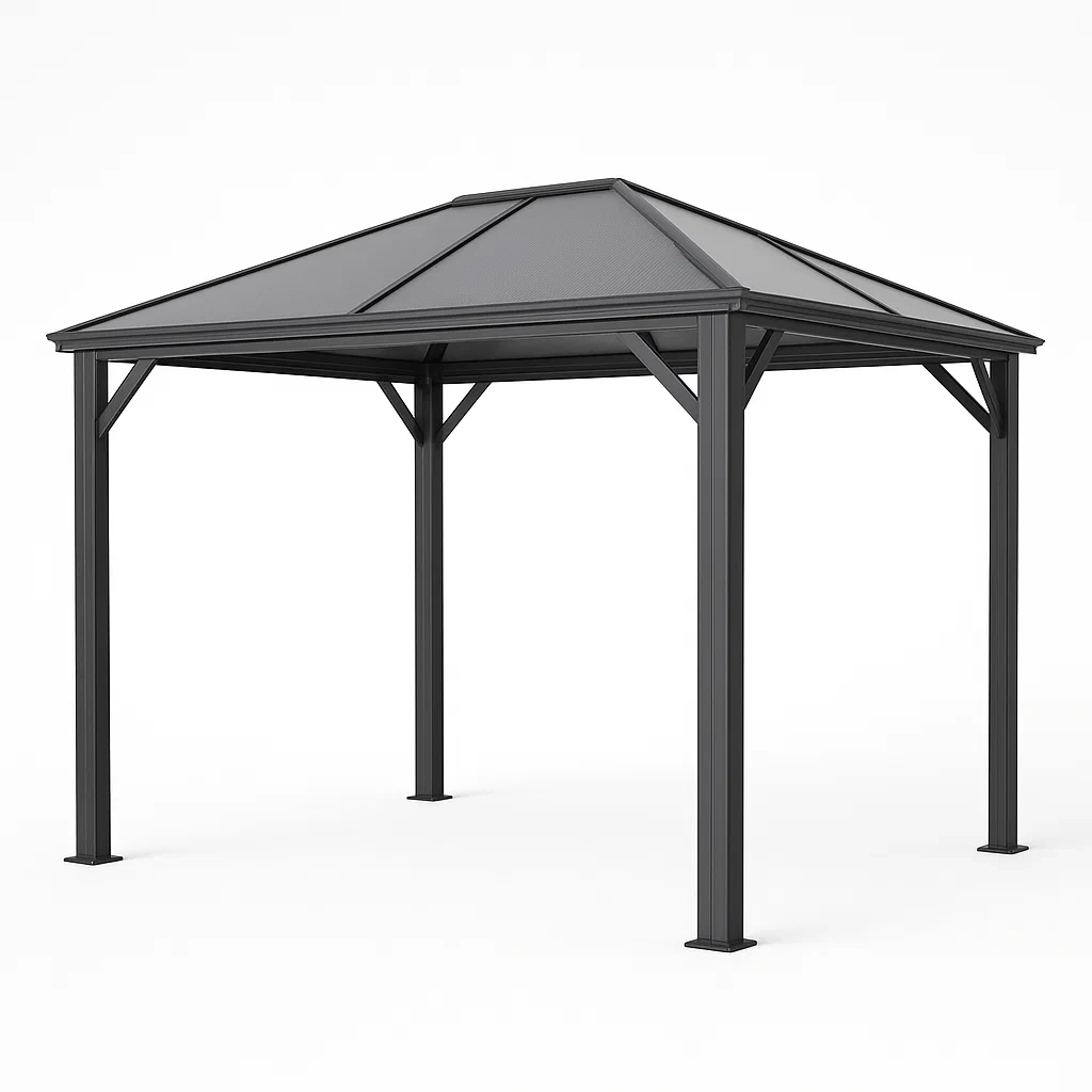 Material: Estructura de acero con recubrimiento en polvo, techo de policarbonato compacto de 6 mm